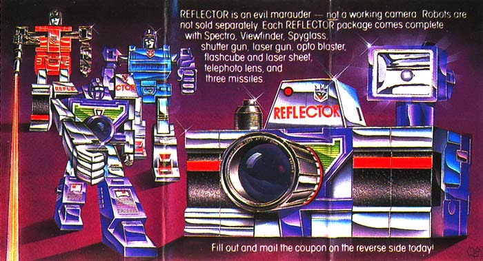 Reflector was first sold in Japan in 1985 as an ordinary retail item. However, Hasbro delayed selling him in the US until 1986, and only then via mail-order from a direct-mail flyer promoting The Transformers: The Movie.
